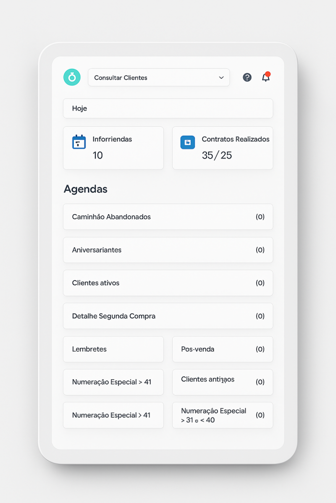 Envie mensagens personalizadas via WhatsApp para seus clientes, organize sua base de contatos com agendas direcionadas para os vendedores e segmente por histórico de compras, preferências e frequência de contato. Acompanhe os resultados da sua loja com dashboards interativos e relatórios detalhados.